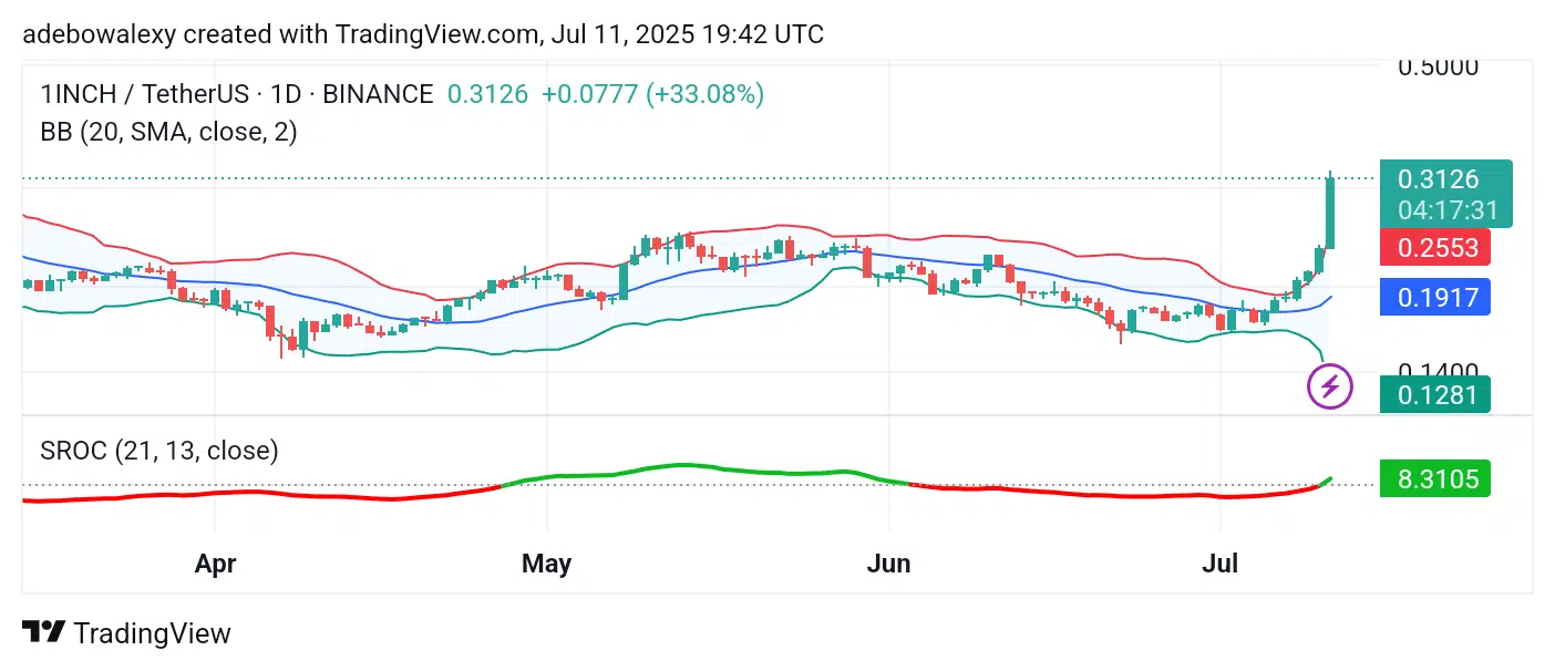 As a result, 1INCH is now trading above the upper band of the Bollinger Bands (BB) indicator. The Smoothed Rate of Change (SROC) indicator has also moved above the equilibrium level, with its terminal point appearing green—signaling that bullish forces are currently in control.