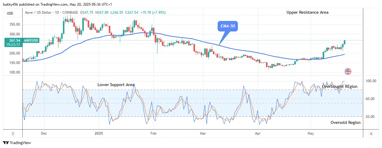 Today, the AAVEUSD price suggests a potential buy signal as it rises to a $267.20 supply level above the moving averages, as the 4-hourly chart begins due to a high bullish impact on the market price.