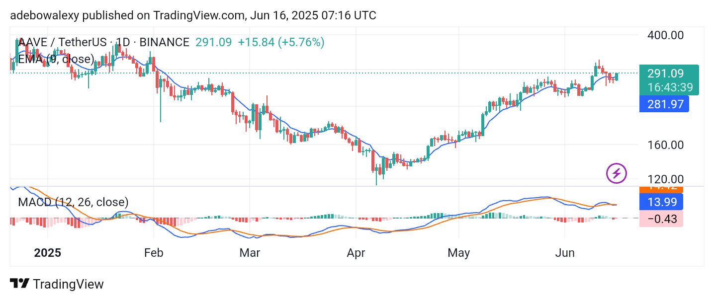 Price activity on the Aave daily chart shows a rebound from the $120 support level on April 9. Since then, the market has remained on an upward path, with price action staying above the 9-day Exponential Moving Average (EMA) for most of the time.