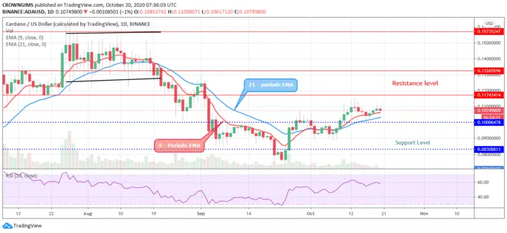 Cardano price continues trading above the 9 periods EMA and 21 periods EMA as a symbol of the bullish movement. The bulls may dominate the ADA market further as the moving averages are steep at an angle of 45 degrees with the formation of bullish candles. Should the price test the resistance level at $0.11 and the daily candle close above it, then, $0.13 and $0.14 resistance levels may be tested. The inability to break up the $0.11 level by the bulls may trigger the bears to take over the ADA market. Meanwhile, the relative strength index period 14 is at 60 levels and the signal line pointing down to indicate sell signal.