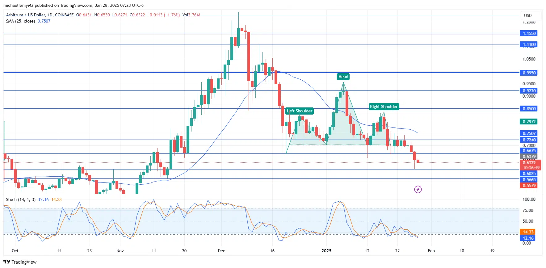 The outcome at the $0.6025 demand level will significantly influence the future direction of the Arbitrum market. The Moving Average (MA) period 25 is positioned above the candles, reflecting the overall bearish trend.