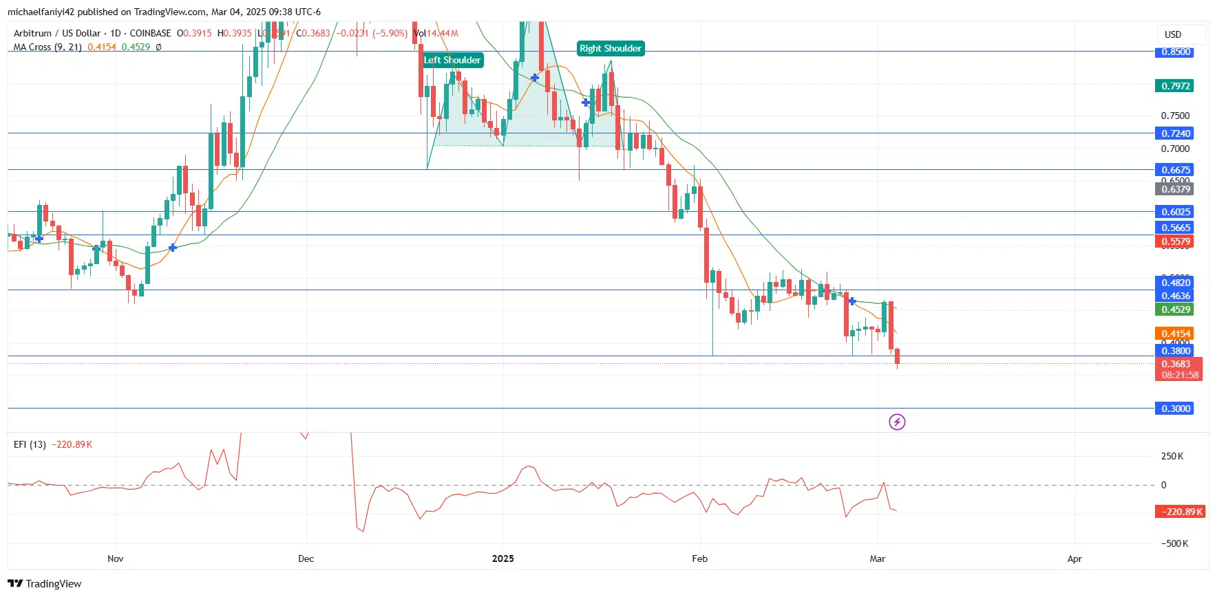 On the 4-hour timeframe, several downward crosses of the MA Cross had already signaled further decline before the price finally broke below $0.3800. With this breach, a continued drop toward $0.3000 now seems plausible..3800 Critical Level" width="1768" height="868" data-lazy-src="https://learn2.trade/wp-content/uploads/2025/03/ARBUSD_2025-03-04_16-38-41.png"/>