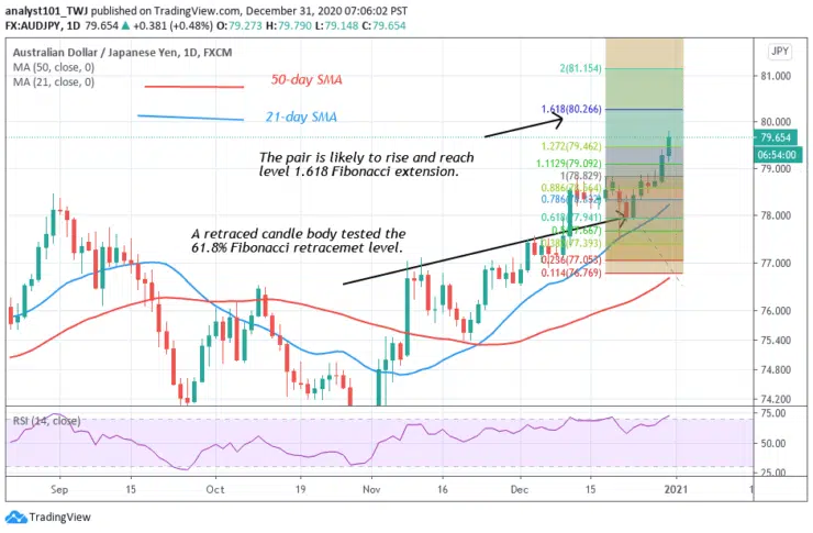 The pair is now in an upward move. The price has broken the resistance at level 78.00. On December 17 uptrend, a retraced candle body tested the 61.8% Fibonacci retracement level. This retracement indicates that the pair is likely to rise to level 1.618 Fibonacci extensions. That is a high of 80.26.