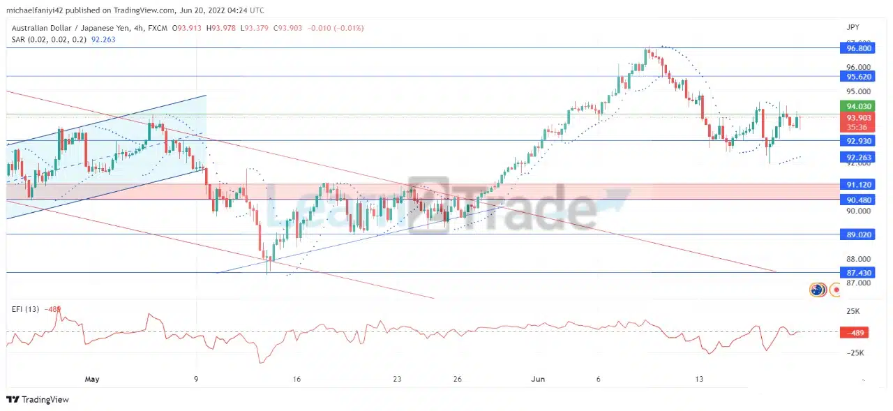 The 4-hour chart shows that the market is now negotiating the 94.030 barrier to go upward. The Parabolic SAR (Stop and Reverse) has more dots aligned below the 4-hour candlesticks to confirm the upward direction of the market. The EFI on the short term is around the equilibrium level. When the market breaks the 94.030 barrier, it will push towards 96.800.