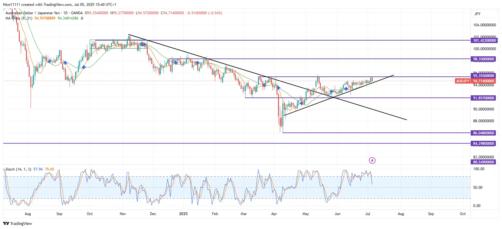 AUDJPY attempted to stretch a pullback into a bullish reversal. Upon reaching the origin of the last bearish displacement at 95.3550, the price experienced a crash. Buyers have reorganized to establish a breakout but now face lethargic momentum.