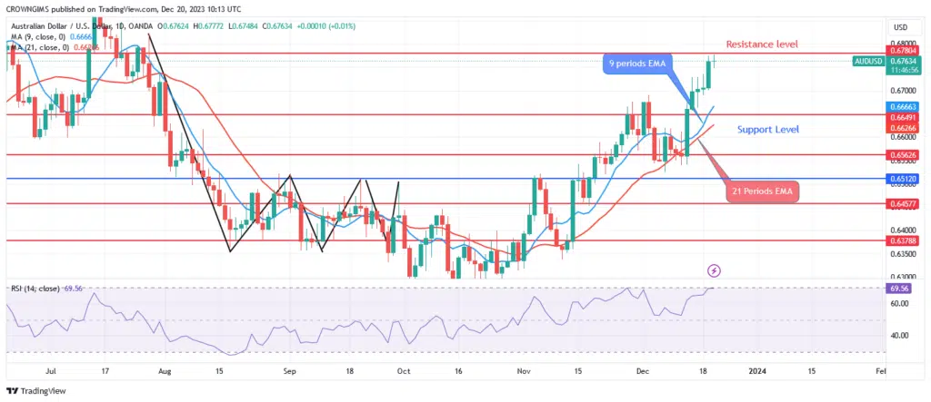 The AUDUSD 4-hour chart is trending upward. The $0.65 resistance and $0.63 support levels have restricted the movement of the currency pair for nearly three weeks. A double bottom pattern emerged on the chart when the price twice tested the anticipated support level at $0.65. As it weakens, the AUDUSD breaks through the $0.66 barrier and moves toward the $0.67 level.