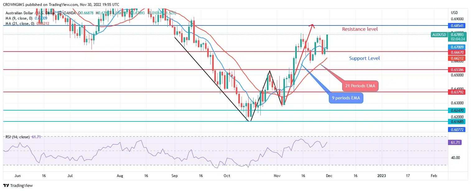 AUDUSD is bullish on the 4-hour chart. The bullish trend continues in the 4-hour chart when a “W” chart pattern formed at the support level of $0.63. The bulls are dominating the AUDUSD market as the formation of the chart pattern is completed at the $0.68 level.