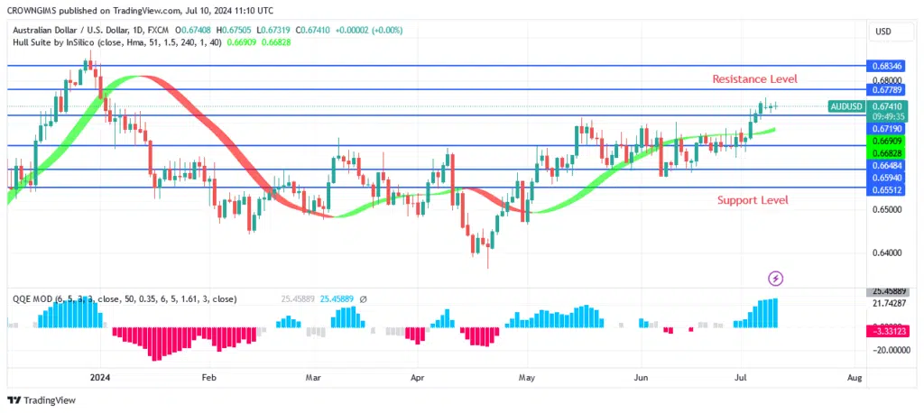 I think we could see more rises in the AUDUSD market. Both the blue histogram and the QQE MOD, which are both above zero, show a positive trend.