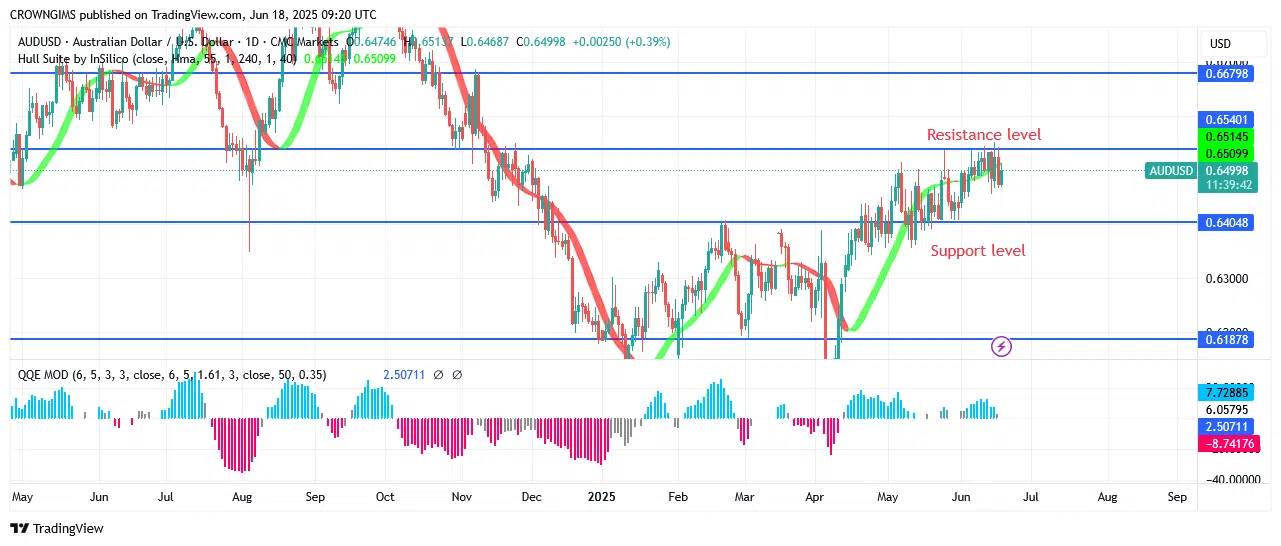 The price may be increased to roughly $0.66 or perhaps $0.67 if buyers are willing to pay more than the $0.65 hedge. Prices may fall to the $0.63 and $0.62 support levels if sellers are able to drive the market below the $0.64 support position.