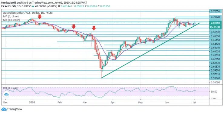 Taking a look at the daily AUDUSD chart we can see that beneath lies the moving average of 5 and 13 with the support of the trendline. Furthermore, bulls are watching the latest 0.7064-level high for a potential upside breakout.