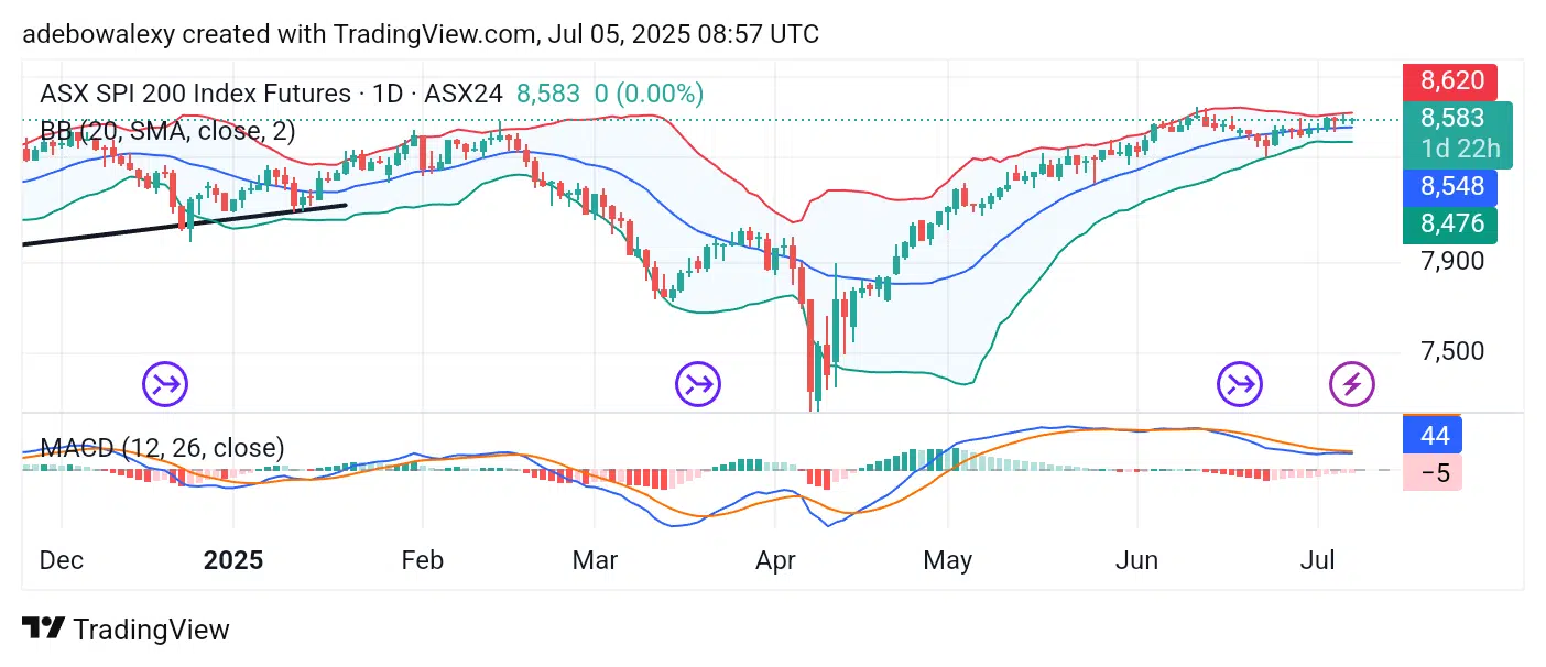 Shifting focus to the 4-hour ASX 200 chart, it is evident that price action has not given up its bullish stance. The most recent price candle sits just above the middle band of the BB indicator. Meanwhile, the BB bands are beginning to converge while tilting upward—indicating that the overall uptrend may still be intact.