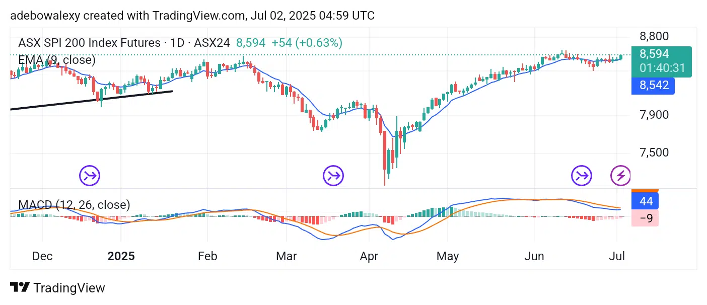 Looking at the ASX 200 4-hour chart, bullish momentum appears to be maintaining a strong grip on price movement. The latest price candle is green and stands tall above the 9-day EMA line. This candle is also more prominent than any other recent price candle.