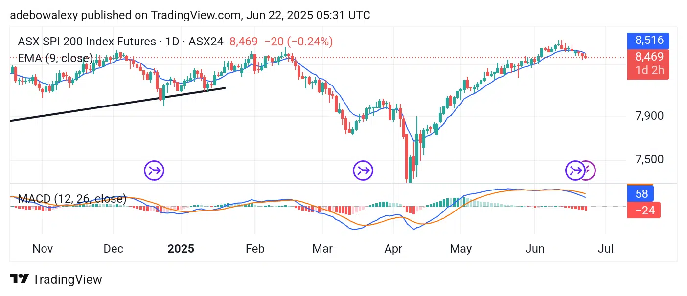 Price activity in the ASX 200 market has shown a minimal retracement to lower levels throughout the past week. At this point, the market is now trading below the 9-day Exponential Moving Average (EMA) curve, which serves as a significant technical marker.