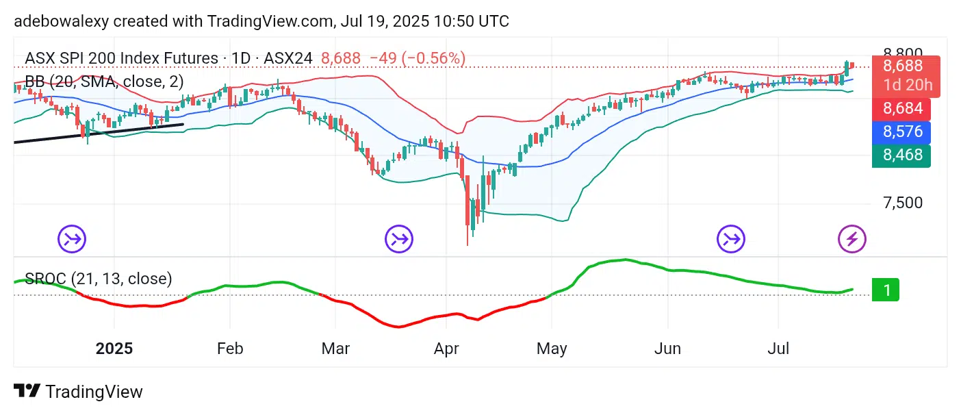 Price movement in the Australia 200 daily chart has been pressing steadily against the upper boundary of the Bollinger Bands (BB) indicator. In the most recent session, price action broke through this upper limit, pushing the index to trade above the BB’s top boundary.
