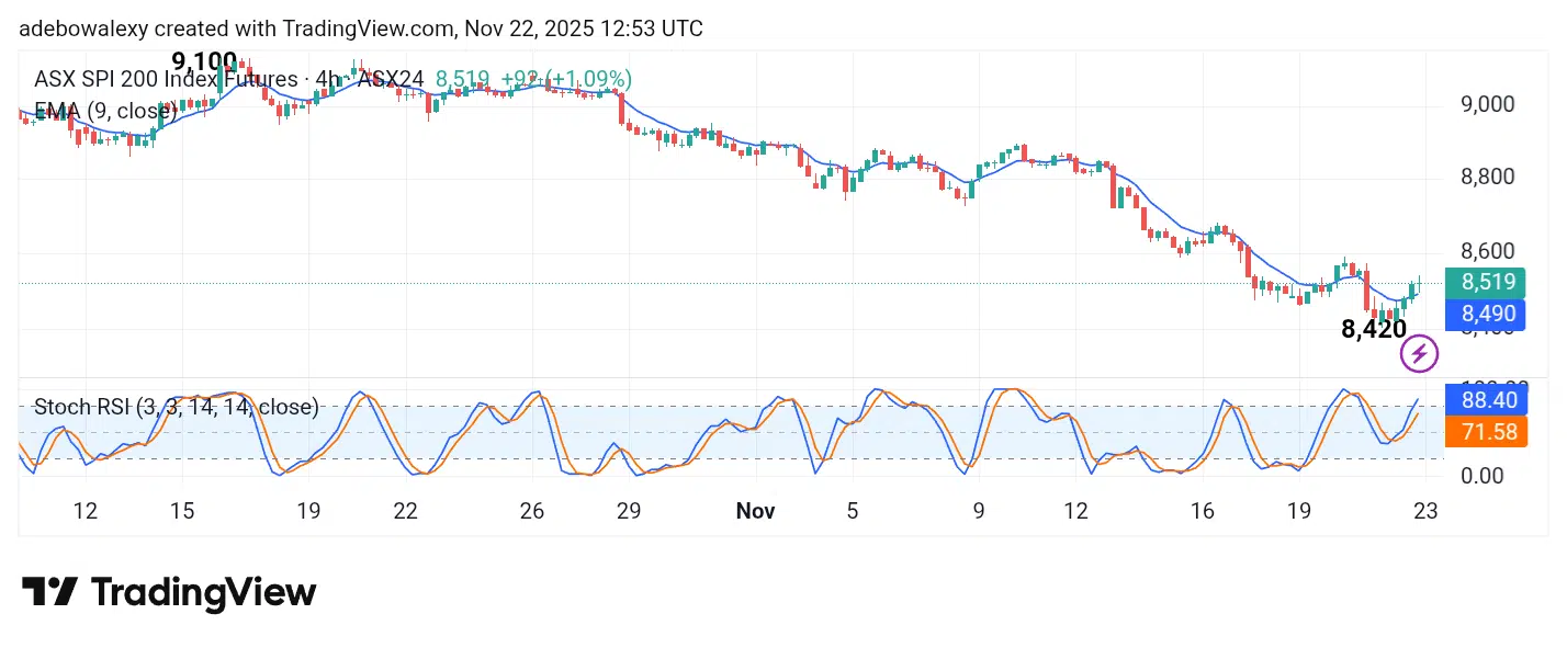 On the 4-hour Australia 200 chart, price action has been retracing upward for the past two sessions. As a result, trading in this market now stands around the 9-day EMA curve. Meanwhile, the SRSI indicator lines continue rising; the lead line has now crossed above the 80 mark.