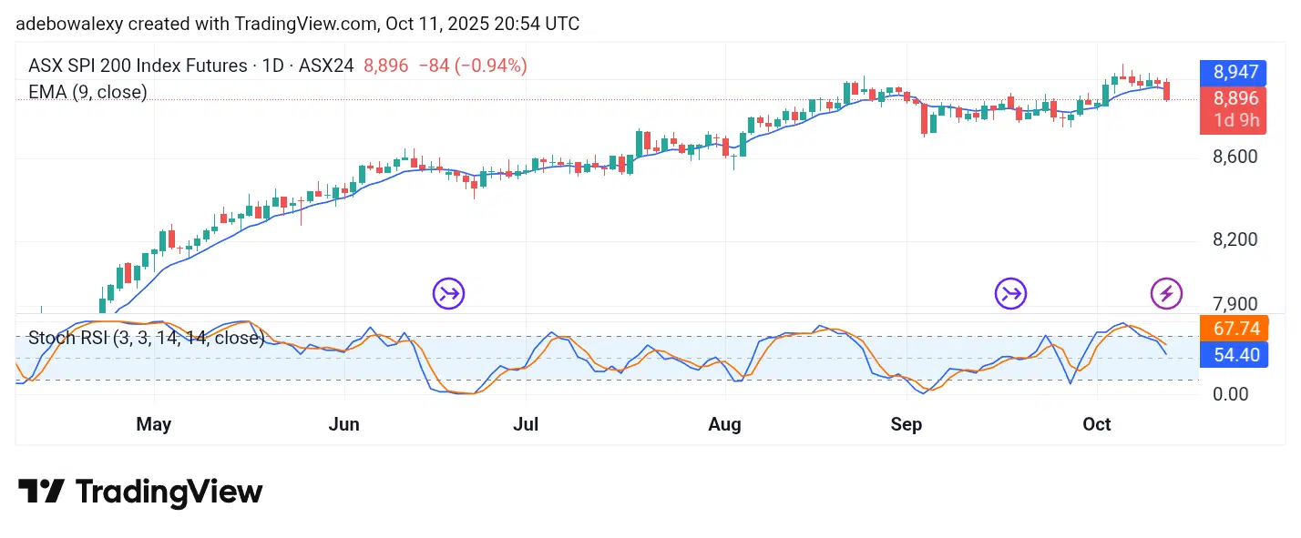 In the Australia 200 market, price action has maintained a downward path for two consecutive sessions. The latest price candle has clearly appeared below the 9-day EMA line. The lines of the SRSI indicator have just delivered a downward crossover after rising slightly above the 9-day EMA curve.