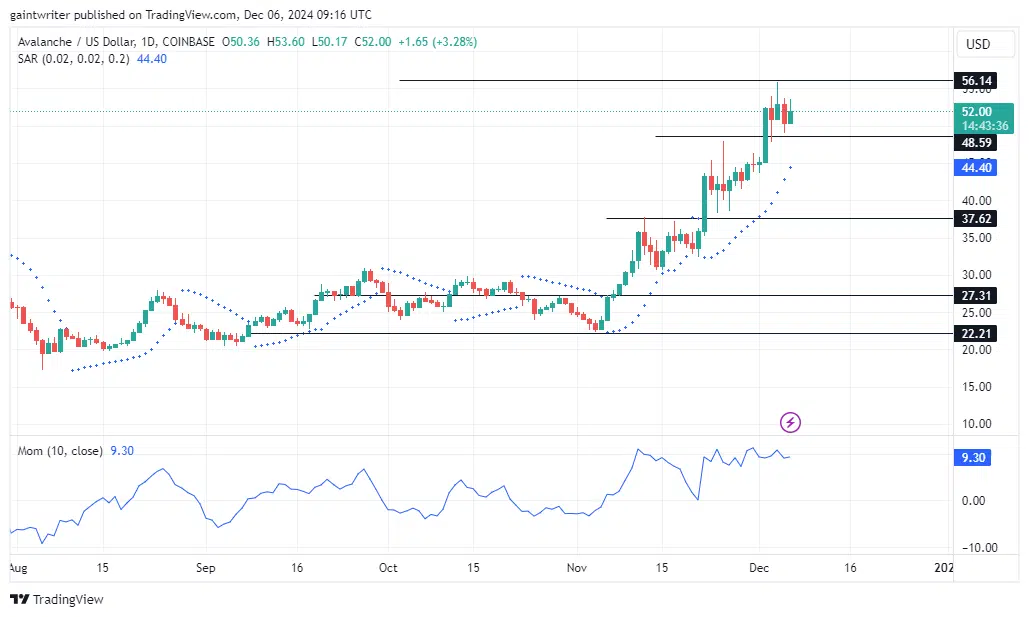 The Avalanche market structure remains decisively bullish, characterized by consistent higher highs and higher lows. After finding robust support at $22.210 last month, buyers have driven the price toward new highs, currently testing the $56.140 resistance level.