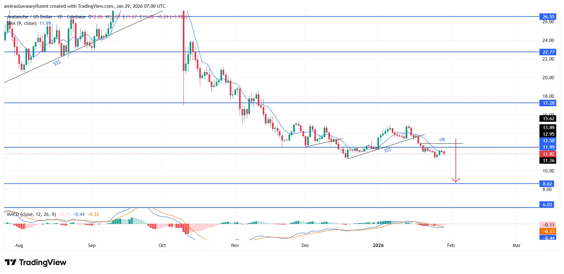 The market continues to print successive lower highs alongside shallow, corrective rebounds, reinforcing the broader bearish structure. The failure to reclaim the $12.50–$12.95 resistance band signals sustained overhead selling interest, while prior recovery attempts were firmly rejected near the $13.80 and $15.60 zones. Recent breaks and retests of minor support levels have resolved lower, confirming that consolidation phases are acting as continuation patterns rather than reversal signals.