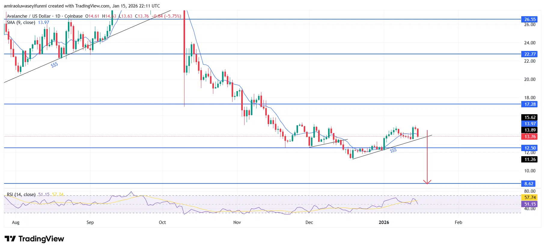 Failure to sustain above the rising trendline and the $13.90 region suggests buyers are losing control, with momentum gradually rolling over. A decisive break below $12.50 would likely accelerate downside continuation toward $11.30 and potentially the $8.60 demand zone.