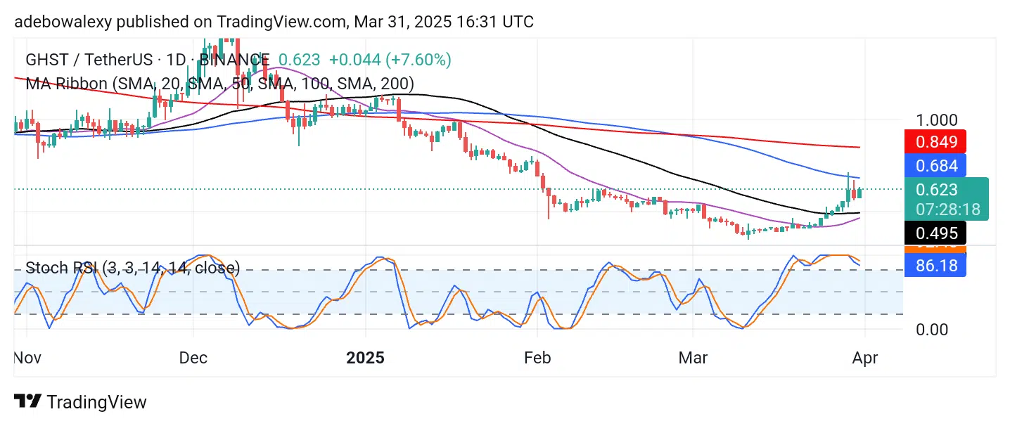 The GHST price action has shown signs of recovery at the time of writing, technically returning the market to an upward trajectory after the previous session’s dip. Currently, trading activity remains above the 20 and 50-day Moving Average (MA) lines.