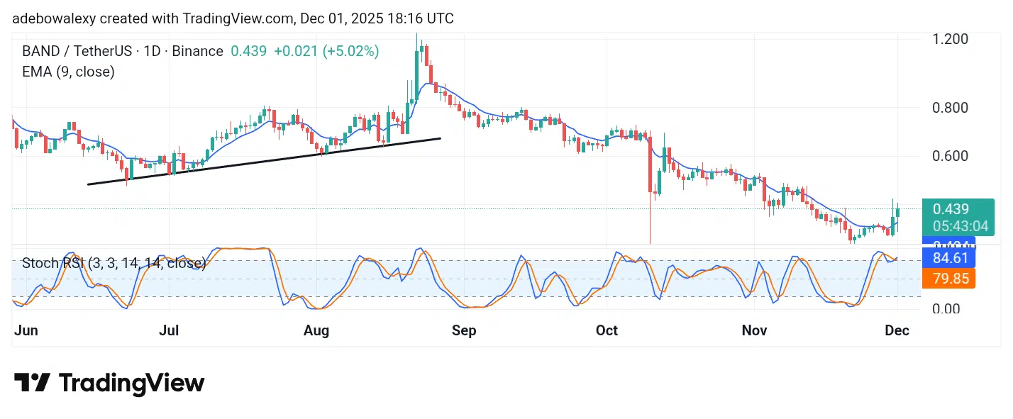 The gain seen on the BANDUSDT daily chart appears to be a continuation of bullish activity from the previous session. This implies that the market has remained in the green for two consecutive sessions. Consequently, price action currently resides above the 9-day Exponential Moving Average (EMA) line.