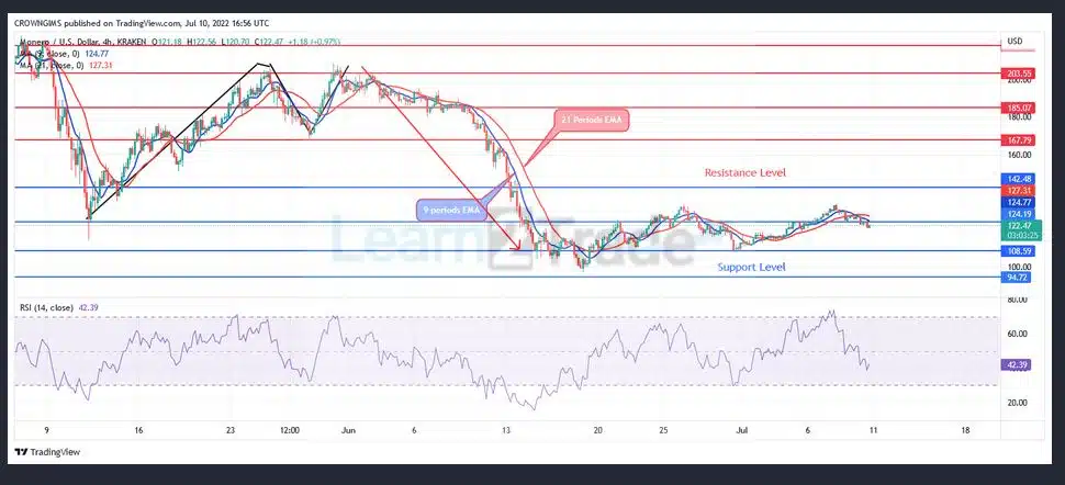 Monero – Guide, Tips & Insights | Learn 2 Trade price is trading above the 9 periods EMA and 21 periods EMA as a sign of bullish momentum. In case the support level of $108 holds, the price may increase towards the resistance levels of $124, $142 and $167. When the bears break down the support level of $108, there may be a price decrease towards the support level of $94, and $88. However, the relative strength index period 14 is at 44 levels with the signal line displaying bearish direction.