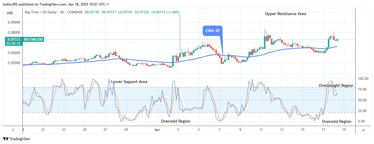 The Big Time market price is going long from the chart above. Buyers pushed the token price to the $0.0741 supply value above the EMA-50 to open today’s 4-hourly session, trying to replenish the bullish momentum.
