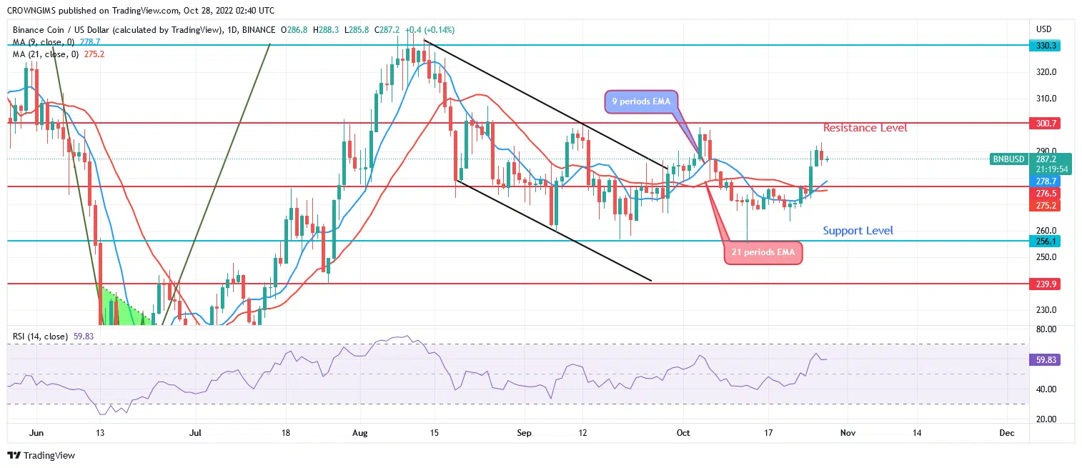 BNBUSD is bullish on the long-term outlook. The crypto follow the direction of our last week prediction. The bulls dominate the market after the formation of chart pattern called Double bottom. The support level of $256 have been tested twice. This triggers a bullish movement towards the resistance level of $300. If the resistance level of $300 hold not the price, it will move towards the resistance level of $330.