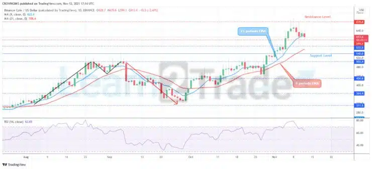 Binance coin is on the bearish movement on the 4 hour chart. The Crypto tested the resistance level of $675 on November 07, the bulls could not push up the price further. A strong bearish candle formed which is an indication of the bears’ interruptions. The coin decreases towards the support level of $572. It is trying to break down $599 level at the moment.