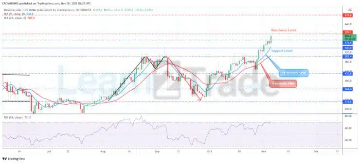 Binance coin is on the bullish movement on the 4 hour chart. When the bears could not push down the price further below the support level of $430. A strong bullish candle formed which is an indication of the bulls’ interruptions. The coin increases towards the resistance level of $540. It broke it up and extends to $572. It is currently increasing to $599.