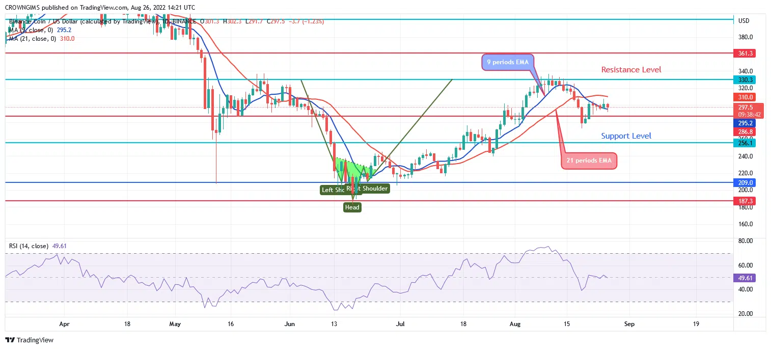 The Binance Coin is trading over and around the 9 periods EMA and 21 periods EMA. The Relative Strength Index period 14 is at 49 levels with the signal lines displaying no specific direction. Should the sellers break down the support level of $286, the price may decrease to $256 level, continue its downtrend movement towards the support level of $209. Conversely, more pressure from the buyers may push up the Binance Coin to break the resistance level of $330 which may increase further to $400 and $456 levels.