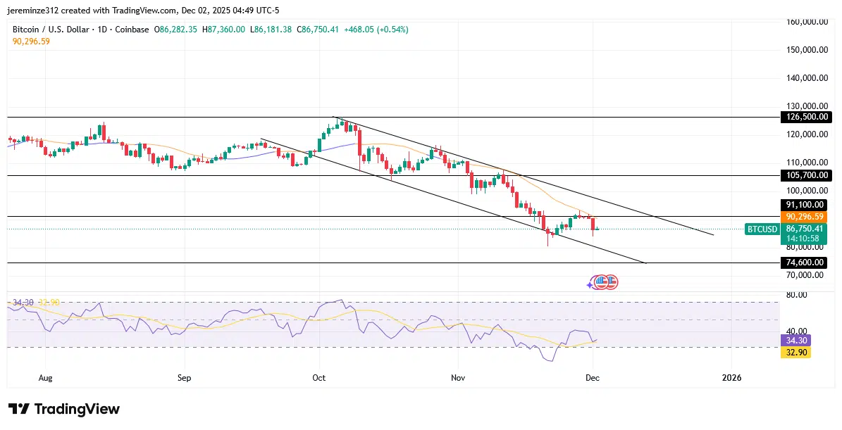 Furthermore, sustained selling pressure pushed price below the $91,100 demand level, followed by a clean retest that confirmed another bearish continuation wave. Although the daily RSI shows oversold conditions—often a zone where bullish reactions appear—current price action still offers no convincing signs of recovery.
