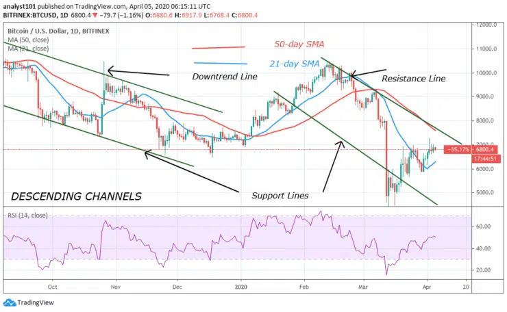 Since April 1, Bitcoin has been fluctuating between $6,000 and $7,000. Today, BTC reached a high of $6,917.90 but the bulls fail to break the resistance level. Consequently, BTC is on a downward move. Its initial fall is likely to be at a low of $6,400. Subsequently, the fall will extend to the low of $5,900, if the $6,400 breakout level fails to hold. However, if the breakout level of $6,400 holds, the market will resume its upward move.