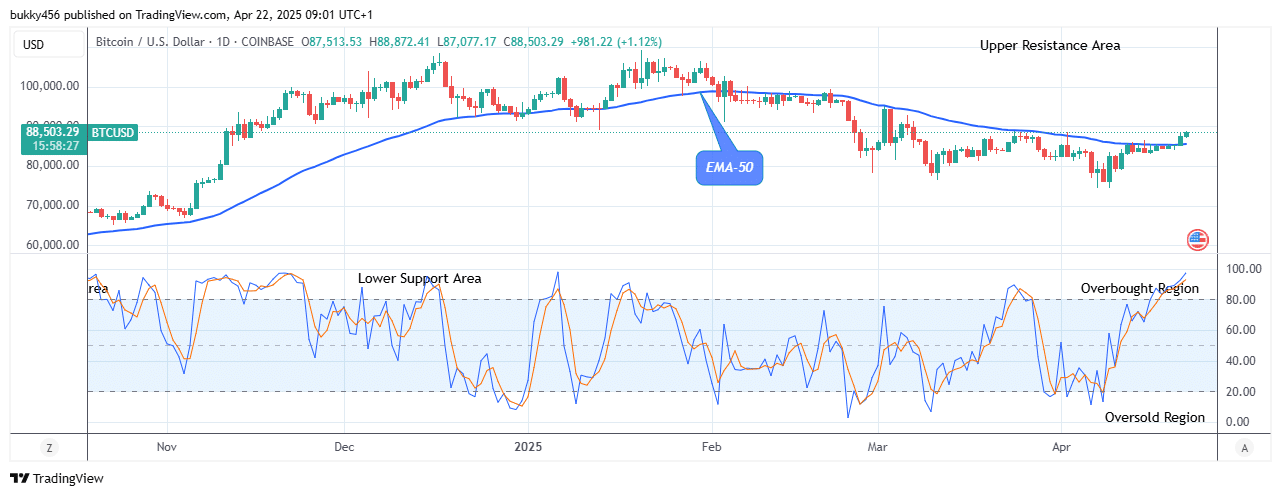 BTCUSD price is moving as it commences a bullish trend, reaching an all-time high of $88,872 amid rising economic concerns. The crypto looked good for a long at its recent high as it continued its bullish run. However, if the bulls can increase their buying activities and break through the $107,200 supply value, the coin price may increase further. In that case, we should anticipate strong upward momentum to the upper resistance level of $108,000 and beyond, turning the crypto world into a profitable market.