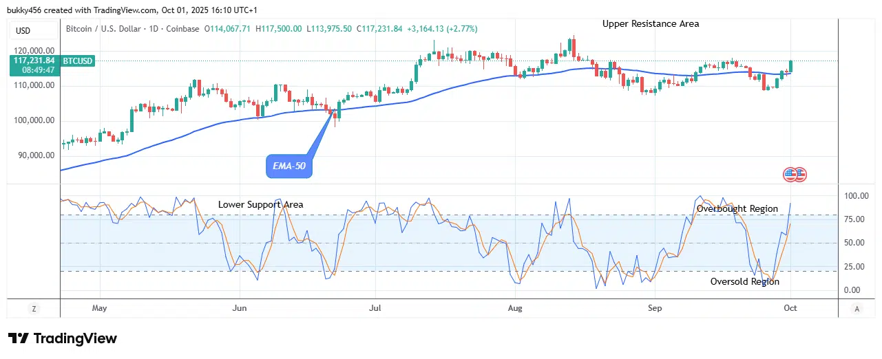 The BTCUSD market price today trades firmly above the supply mark, facing high demand from the bulls. The coin is at the edge of a strong bullish breakout and continuation, providing a good buying opportunity at $117,500. Hence, the crypto price may rise further to a high trend line of $125k if the bulls’ pressure breaks through the peak resistance level of $123,740, which would represent a turnaround for coin holders.