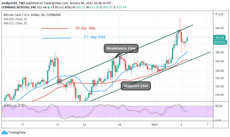 BCH bulls have broken the $380 overhead resistance as the market reaches a high of $434. On January 3, the uptrend reached a high of $467 but was resisted. BCH fell to the support above $380 and resumed a fresh uptrend. BCH is rising and approaching the $440 price level. BCH will attain a new high of $520 if the $440 resistance is breached.