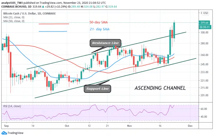 On November 20, BCH rebounded twice above $246 to breach the $280 overhead resistance. The bullish momentum extended to retest the $320 high. Presently, the coin is fluctuating below the $320 resistance. The bulls could not penetrate the recent high.