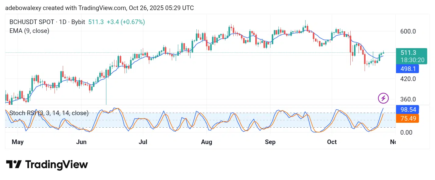 Price movement in the BCH daily chart has moved above the 9-day Exponential Moving Average (EMA) curve. Since the previous session, the corresponding price candle has been relatively small. The ongoing session has formed a green but compressed candle with an upper shadow, indicating reduced bullish momentum.