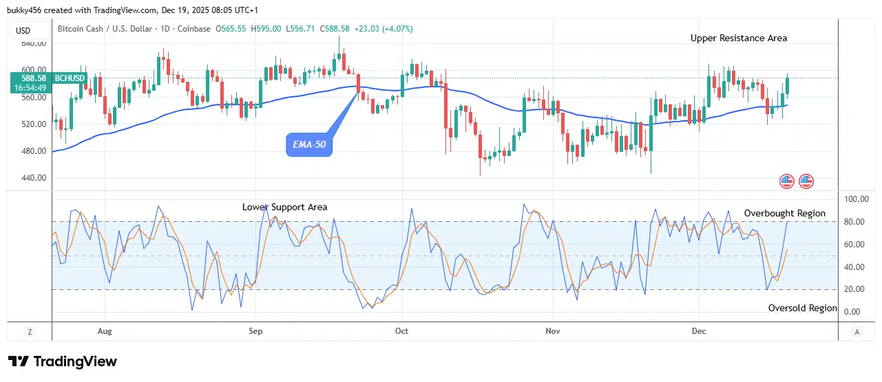 The market price of BCHUSD, which surges to a $589.92 high level, suggests an improved bullish market sentiment.