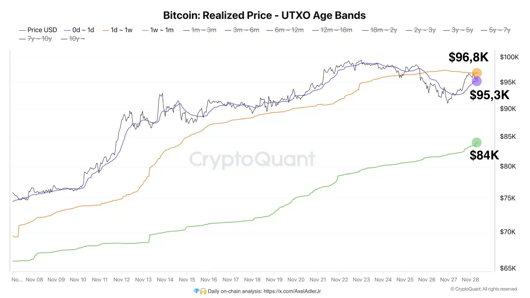 On-chain data from CryptoQuant analyst Axel Adler reveals critical price support zones that highlight Bitcoin’s strong market position. Two key investor groups are actively accumulating at current levels: short-term holders with an average entry point of $96,800 and medium-term investors who entered around $95,300.