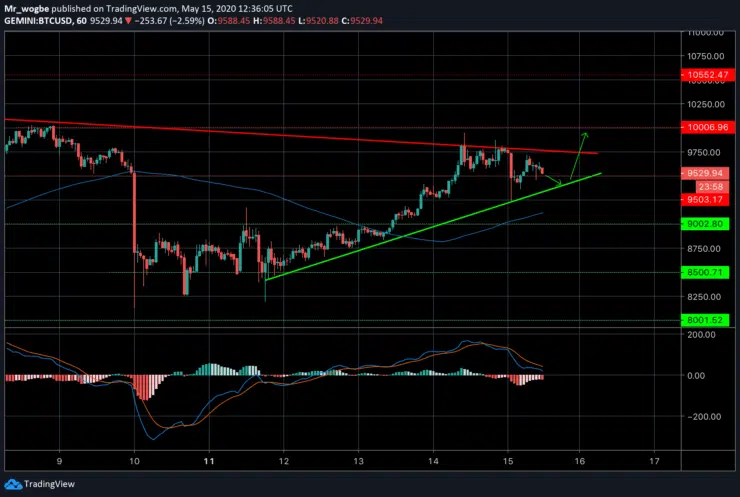 A crucial bullish trend line has been forming for some days now with support around $9,200 on the hourly chart. As long as BTC continues trading above this line and the hourly 100-day moving average, breaking the 5-digit hurdle should be a walk in the park. Failure to stay above these levels could spell the opposite. However, it is believed that BTC is in a slight reversal at the moment, so a quick retrace towards the $9,200 area could be seen soon.