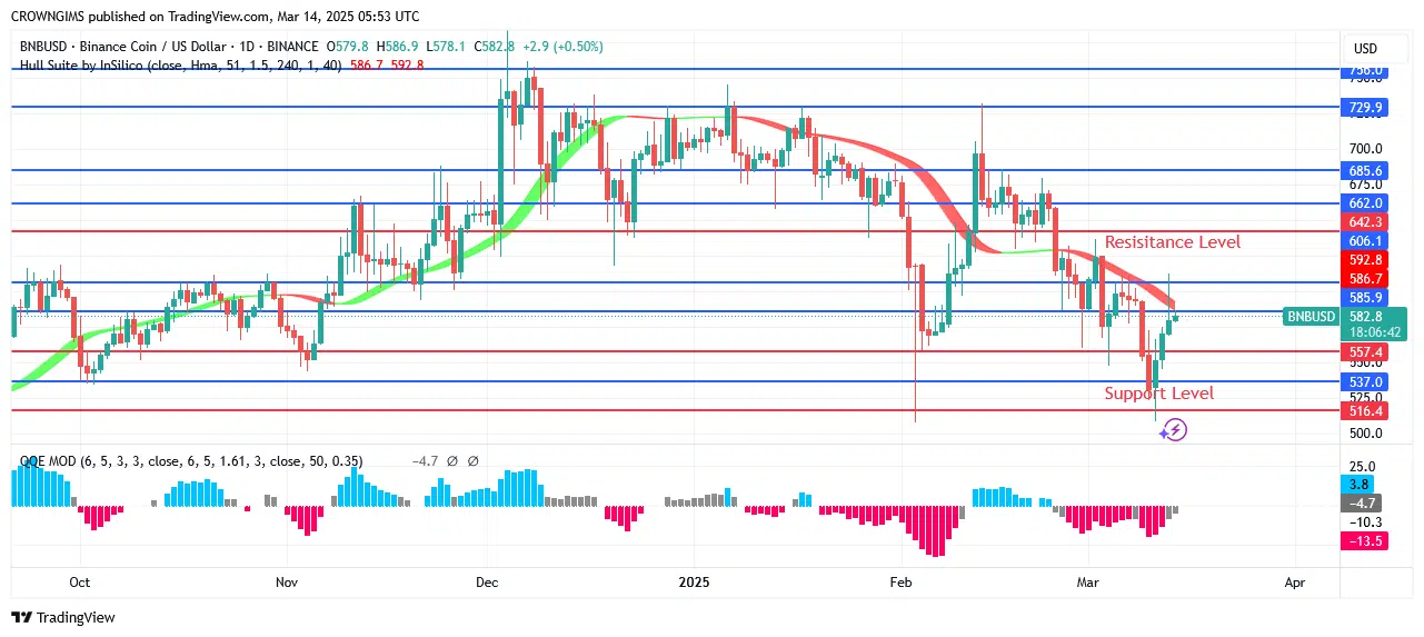 The Hull Suite FX indicators show that the price of the BNBUSD is currently falling below the crypto currency signals. If buyers can hold onto the $5585 support level and break above the $586.5 resistance level, they might be able to drive the price to test the $606.1 and $642.6 resistance levels. If BNB can break through the crucial $558.5 barrier, it should target the previous lows of $537.0 and $516.3.