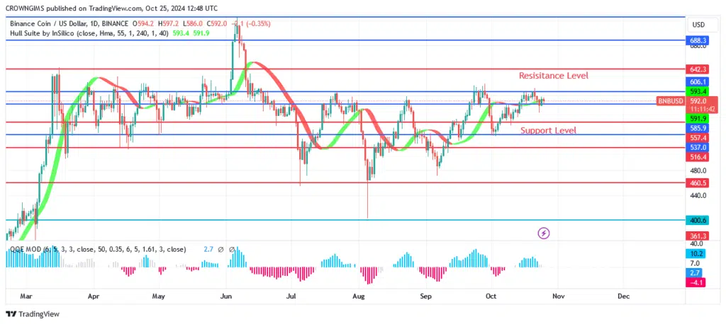 If buyers can hold onto the $586.5 support level and break above the $606.1 resistance level, they might be able to drive the price to test the $642.3 and $688.3 resistance levels. If BNB can break through the crucial $586.5 barrier, it is anticipated that it will test the prior lows of $557.9 and $537.0.