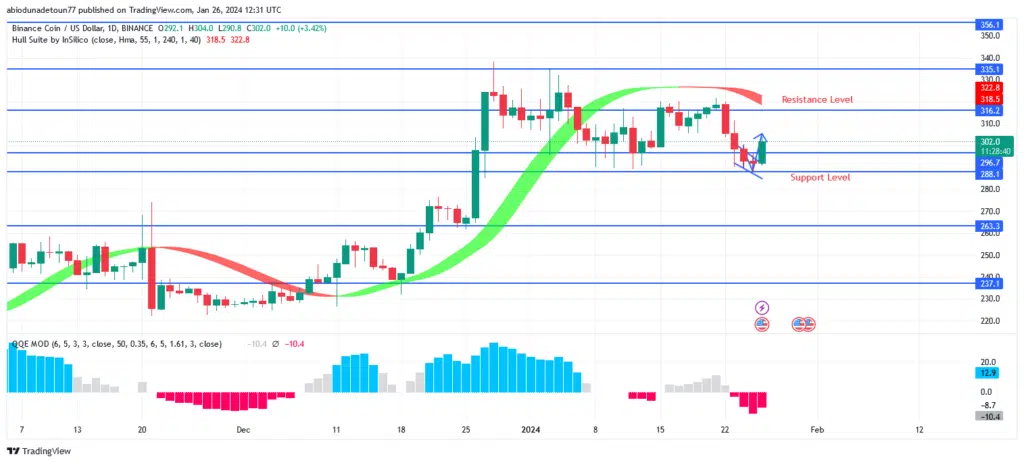 The $335.1 and $356.1 resistance levels could be in peril if buyers holding the $297.0 support level smash the $316.2 resistance level. It will test the recent lows of $263.3 and $237.1 if BNB closes below the critical $297.0 barrier and $316.2 holds.