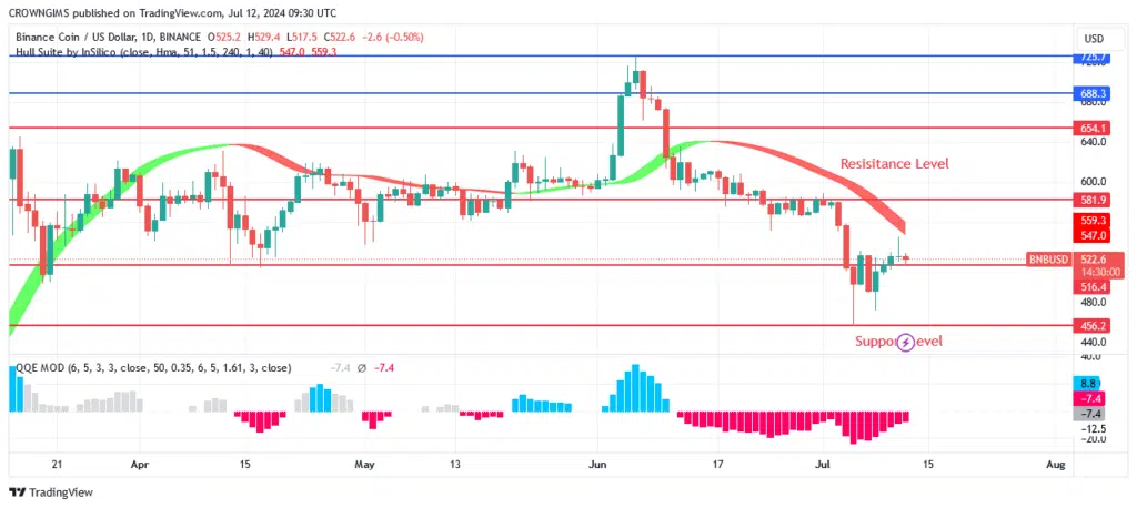 Buyers may be able to test the $581 and $654 resistance levels if they can overcome the $516 resistance level and hold onto the $456 support level. BNB will test the previous lows of $400 and $362 if it breaks below the critical $456 level and $516 holds.