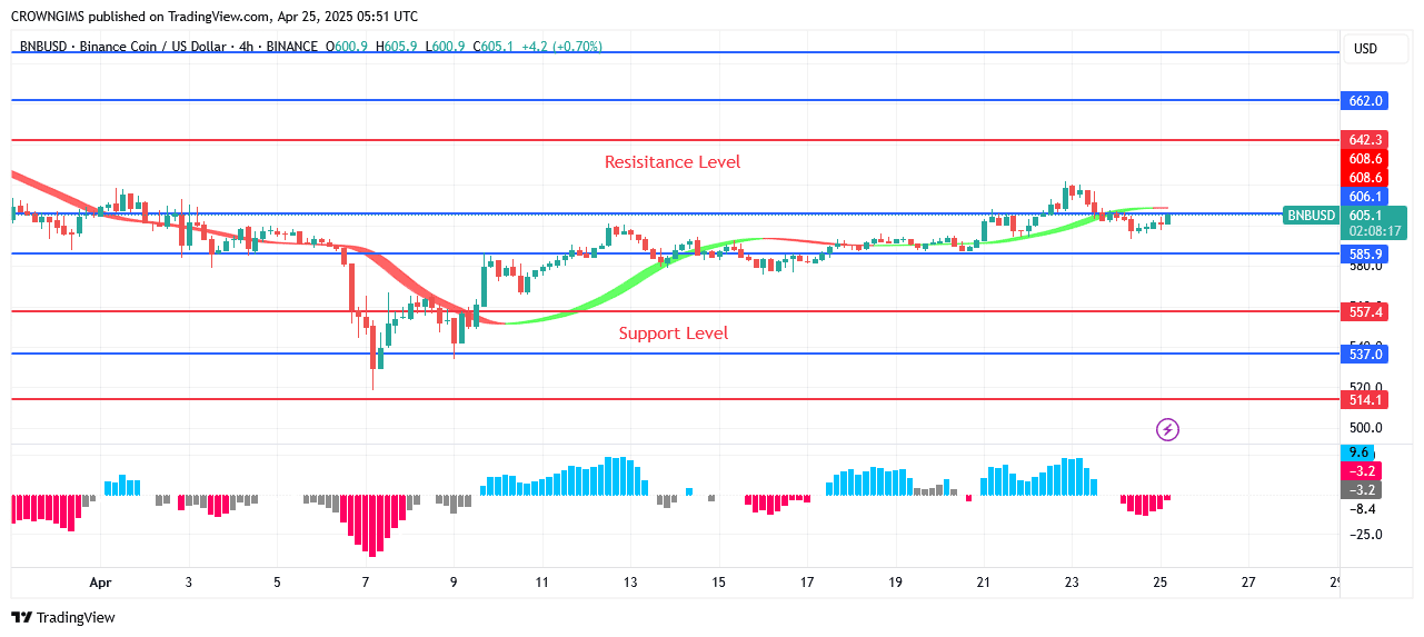Buyers may be able to push the price to test the $642.3 and $662.0 resistance levels if they can hold onto the $586.2 support level and break above the $606.1 resistance level. If BNB can break over the crucial $586.2 barrier, it should target the previous lows of $557.9 and $537.5.