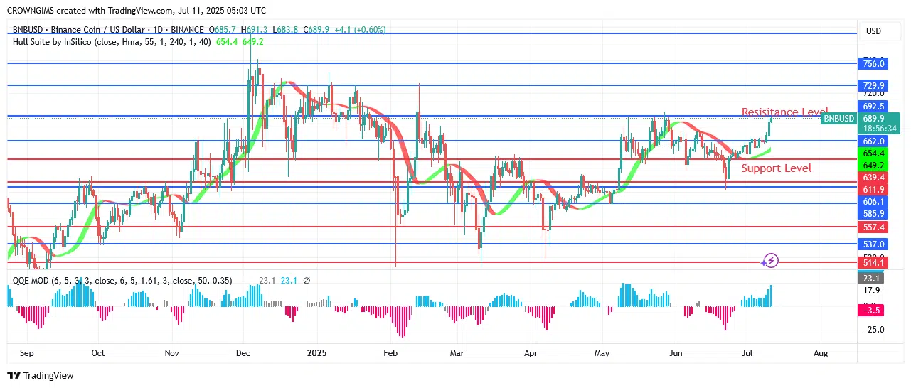 The Hull Suite FX data indicates that the price of the BNBUSD is presently rising above the cryptocurrency’s indicators. If buyers can hold onto the $662.3 support position and break above the $692.4 resistance position, they might be able to push the price to test the $729.9 and $756.0 resistance levels. BNB should aim for the previous lows of $640.5 and $606.8 if it can break below the crucial $662.3 hedge.