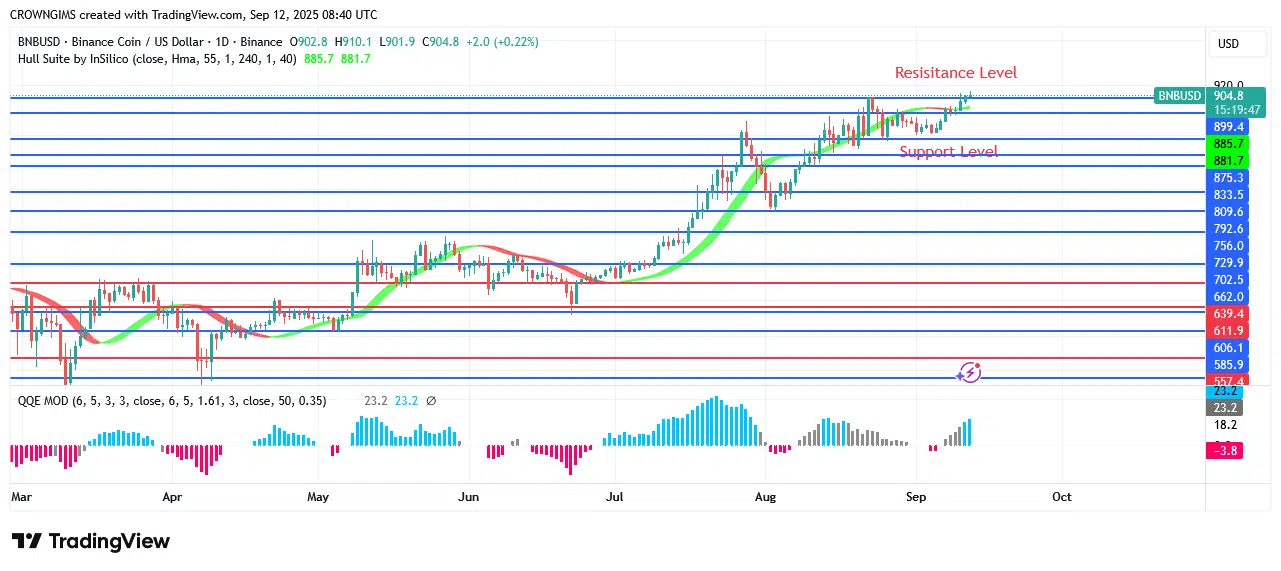 The BNBUSD price is presently surging above the cryptocurrency’s indications, according to the Hull Suite FX analytics. Buyers may be able to push the price to test the resistance levels of $878.0 and $882.2 if they can hold onto the $840.0 support position and break above the $866.0 resistance position. If BNB can break below the critical $840.0 hedge, it should target the prior lows of $792.6 and $756.0.