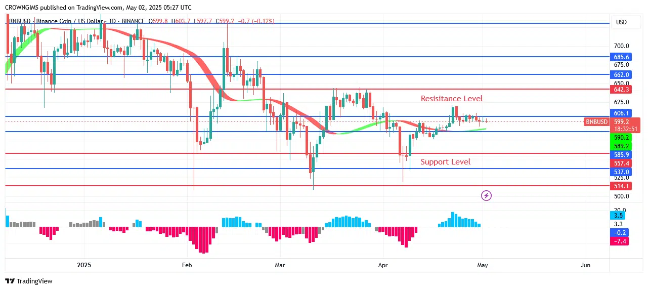 The Hull Suite FX pointers indicate that the price of the BNBUSD is currently rising above the crypto currency indications. If buyers can hold onto the $586.2 support position and break above the $606.1 resistance position, they might be able to drive the price to test the $642.3 and $662.0 resistance circumstances. BNB should aim for the previous lows of $557.7 and $537.6 if it can break below the crucial $586.2 hedge.