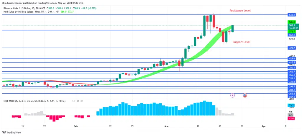 The coin will move north for the next four hours. A rising trend started when the BNB crossed $428. This was noted on January 25th, not far from the $480 resistance level. The result was price increases. On March 8, the resistance level of $480 was breached, and the $635 level was put to the test. Right now, the price is facing the previous high at $635 barrier level.